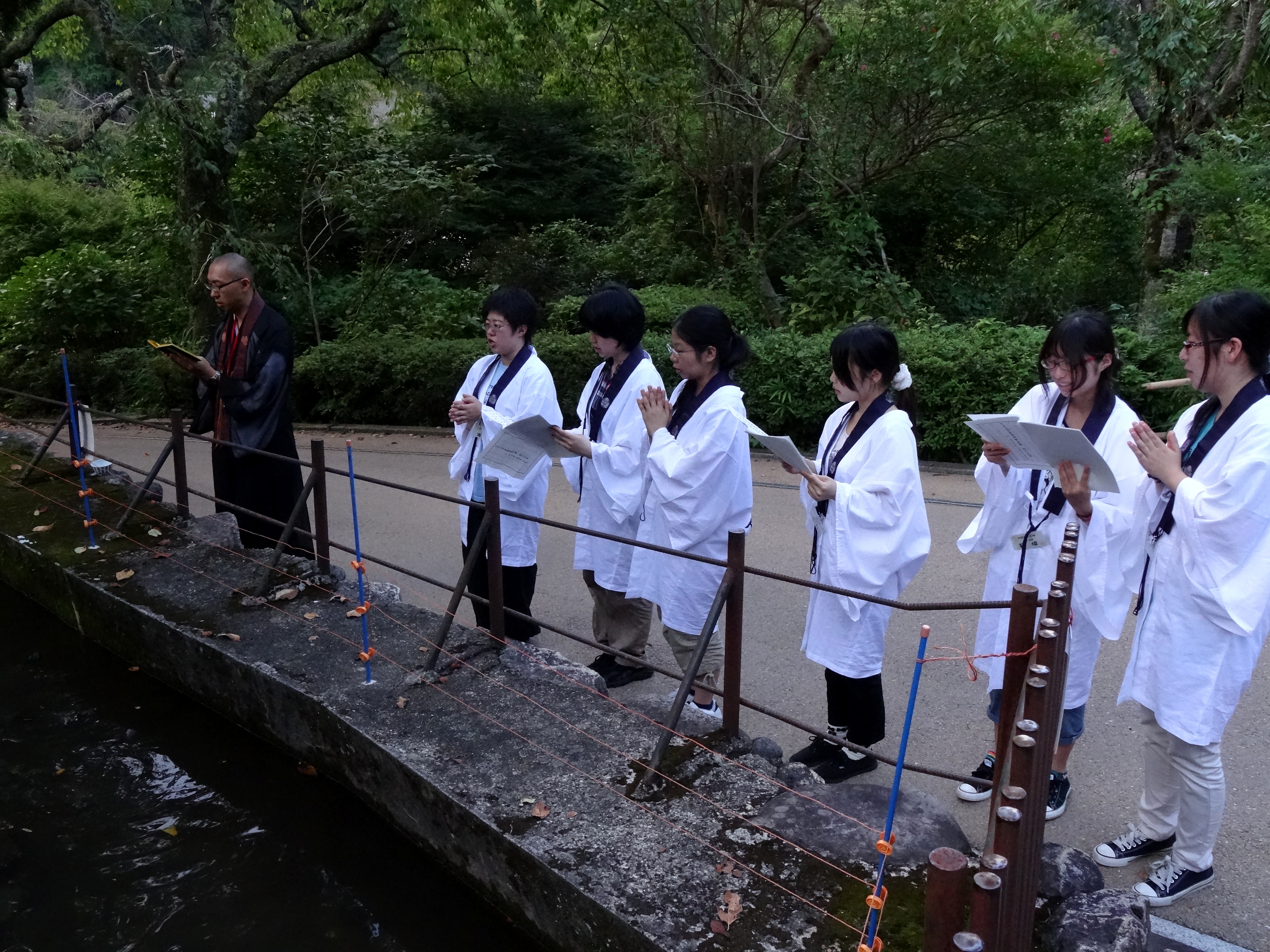 まずは朝の勤行の様子です。毎朝7時、涼やかな空気と朝の日射しの中、本堂外舞台前、御本尊十一面観世音菩薩のお膝もとで『錫杖経』や『観音経』を読誦します。最初は慣れない読経も、最終日になると長谷の僧侶の方の声に合わせて一緒にお称えすることができるようになってきます。