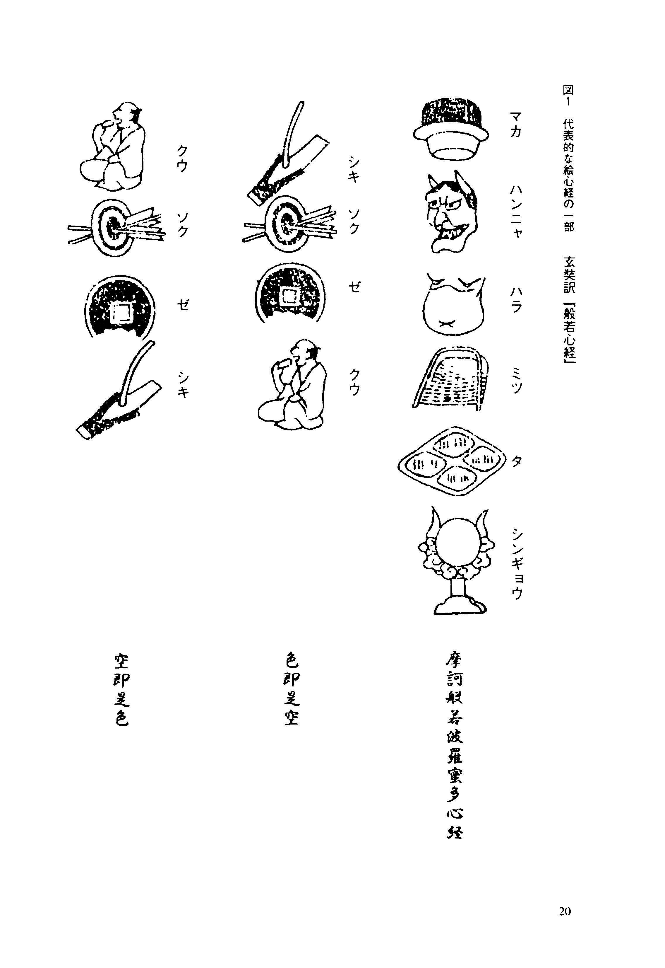 『絵心経』とは、文字の普及が十分でない時代に、絵文字という表現方法で経文の読み(音)をあらわしたものです。たとえば、「摩訶(まか)」は、釜(かま)をさかさまにして、その音を表しています。そうした『絵心経』には、「田山系」と「盛岡系」の2系統あります。『般若心経』以外にも、いくつかの陀羅尼も、このような絵文字で書かかれています。つまり、経典の記憶と解説に努めた証として、文化史的にも、民俗学的にも重要な価値をもっているので、1冊の本としてまとめてみたのですよ。