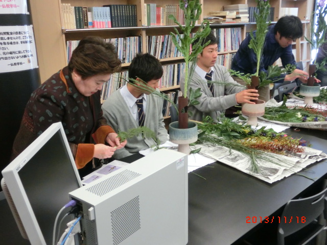 この授業の担当の先生である野口圭也先生も、この日は辻井先生の生徒として学生さんと並んでいけばなに挑戦しました。![]()