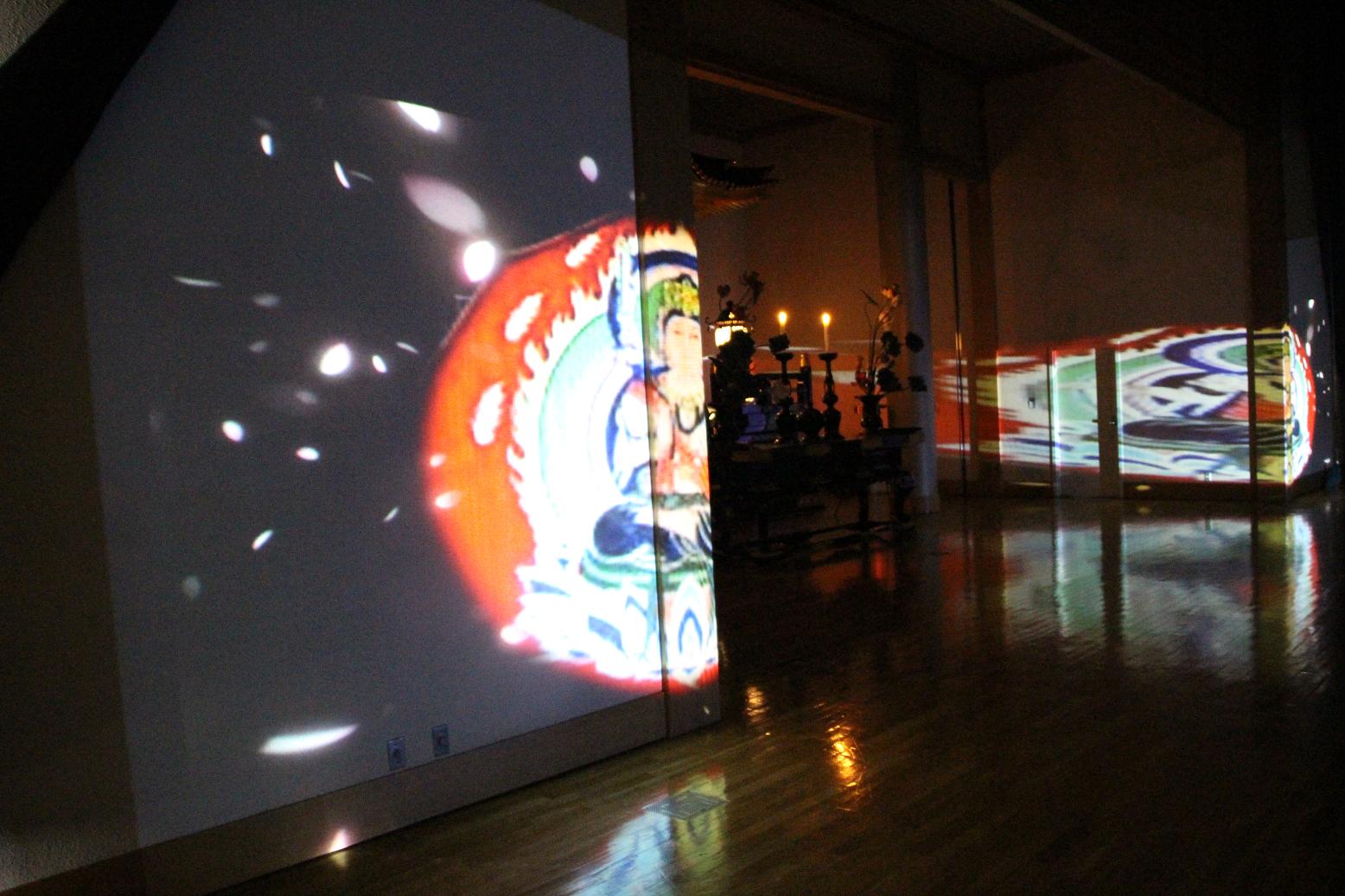 今年の成道会は石原先生と表現文化学科の学生によるプロジェクションマッピングの演出が行われたのです。