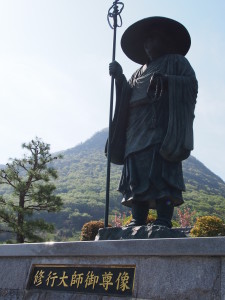 ★このように修行中の姿をした空海像が各地で見られます。こちらは七十三番札所出釈迦寺の像。お遍路さんの伝統的な装束もまさにこういう感じです。