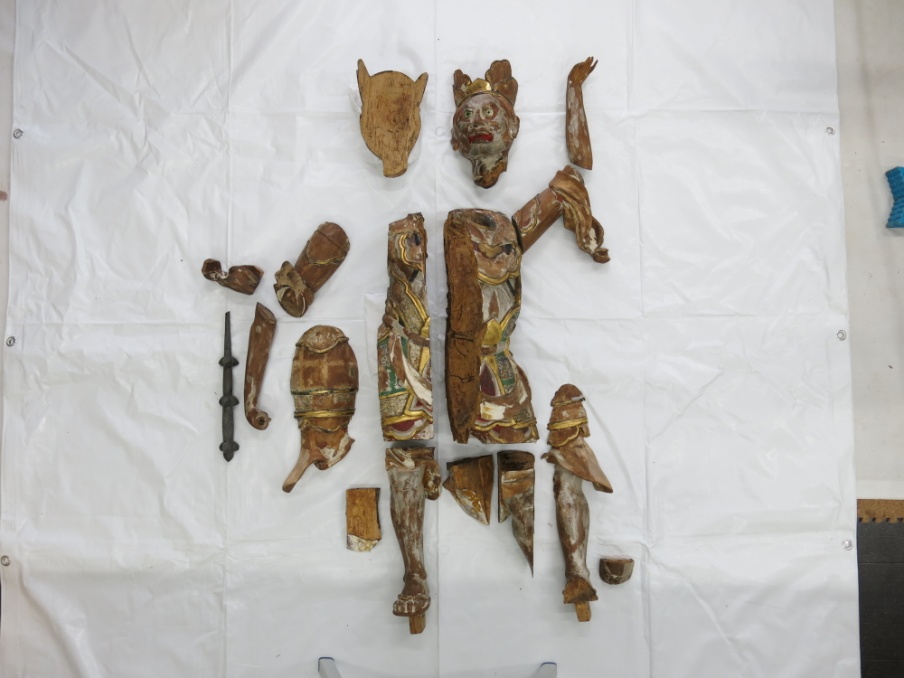 この像は、薬師如来の眷属として十二体一組で制作された「十二神将」の一体です。木と木を繋ぎ合わせた寄せ木造りのため、長い時間で接着がゆるみ、頭や腕などがはずれていました。