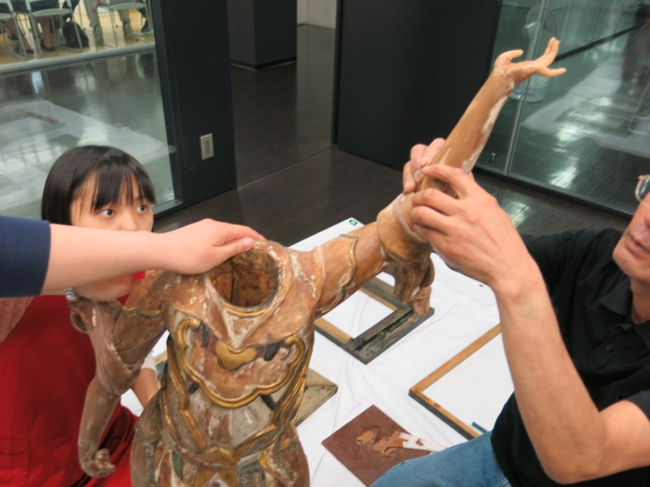 最後に岩座と本体を安定させれば、修復完了です。制作当初の動きのある姿にもどったことがおわかりいただけると思います。この像は、学生による修復の成果として学園祭にて展示されました。本講義での仏像修復について、今後も随時ご報告していきたいと思います。