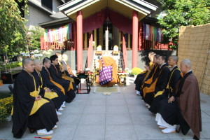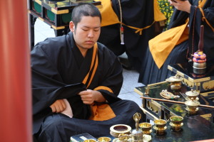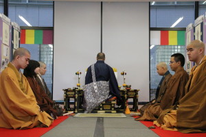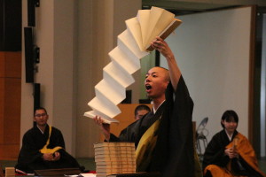 まずは仏教学科の花といえる、学生による「法要」です。さざえ堂御前にて4宗派(天台宗・真言宗豊山派・真言宗智山派・浄土宗)の法要をいたしました。一方、礼拝堂ご本尊御前にて豊山派の学生による「大般若転読」は、ダイナミックな手法と読経の音程に引き込まれるようでした。もてるすべての力を注ぐ姿は美しく、読経の声や所作は来場者の心を満足させていたようです。