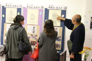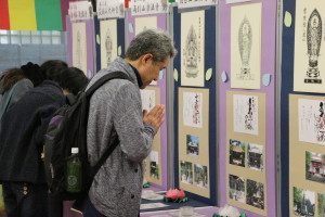 今回のメインとなる企画として「坂東三十三観音霊場お砂踏み」。6月頃より坂東三十三観音札所の霊場会にご協力を仰ぎ、三十三ケ寺にご対応いただきました。夏休みに入り、学生や教職員が各お寺をめぐり、お砂と御朱印を頂きました。この企画に賛同し、後押ししてくださったご住職も多く、暖かく見守ってくださり感謝しててもしきれません。当日の朝には、神達知純准教授を導師として法楽がされ、いよいよお手製のお砂踏み会場に魂が吹き込まれたときには、感慨無量でした。11月5・6日の2日間で来場者は約400名となりました。