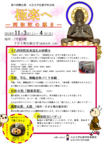 またまた来ましたこの季節 第6回鴨台祭のお知らせです!! 平成最後の鴨台祭をこの目に焼き付けよう!!(。-`ω-)✧ 2018年11月3日(土) 2018年11月4日(日) 両日とも10時開場です! 仏教学科で行われるイベントは ・八阿弥陀如来巡礼お砂踏み(参拝料) ・写経、写仏、念珠作り体験(参加費、材料費) ・極楽茶屋【お休み処】(有料) ・護摩法要 ・阿弥陀市【バザー】 等々やりますので、是非ともご参加ください!!