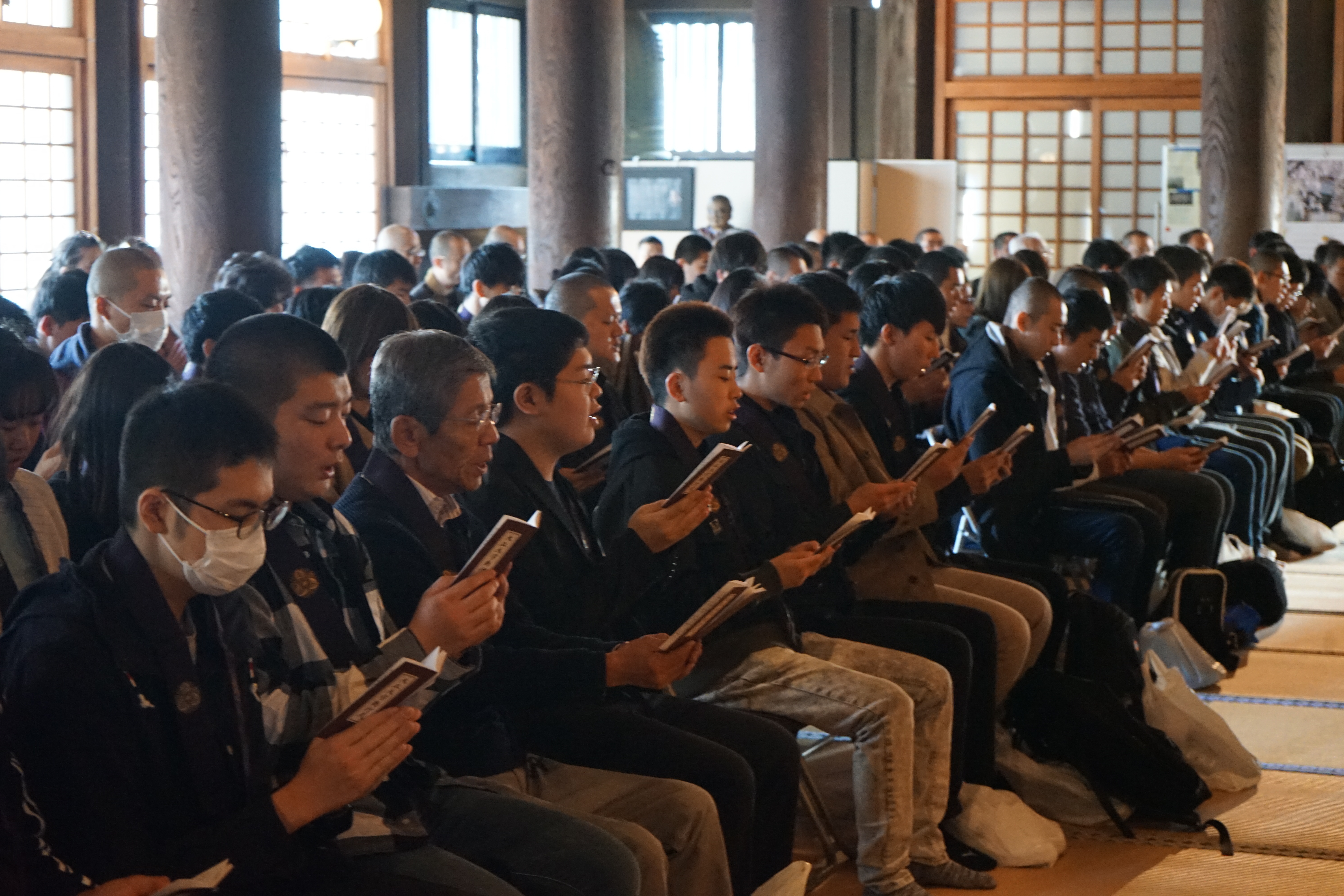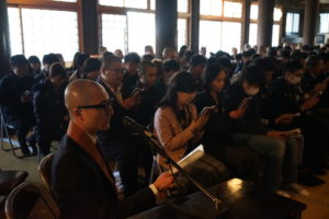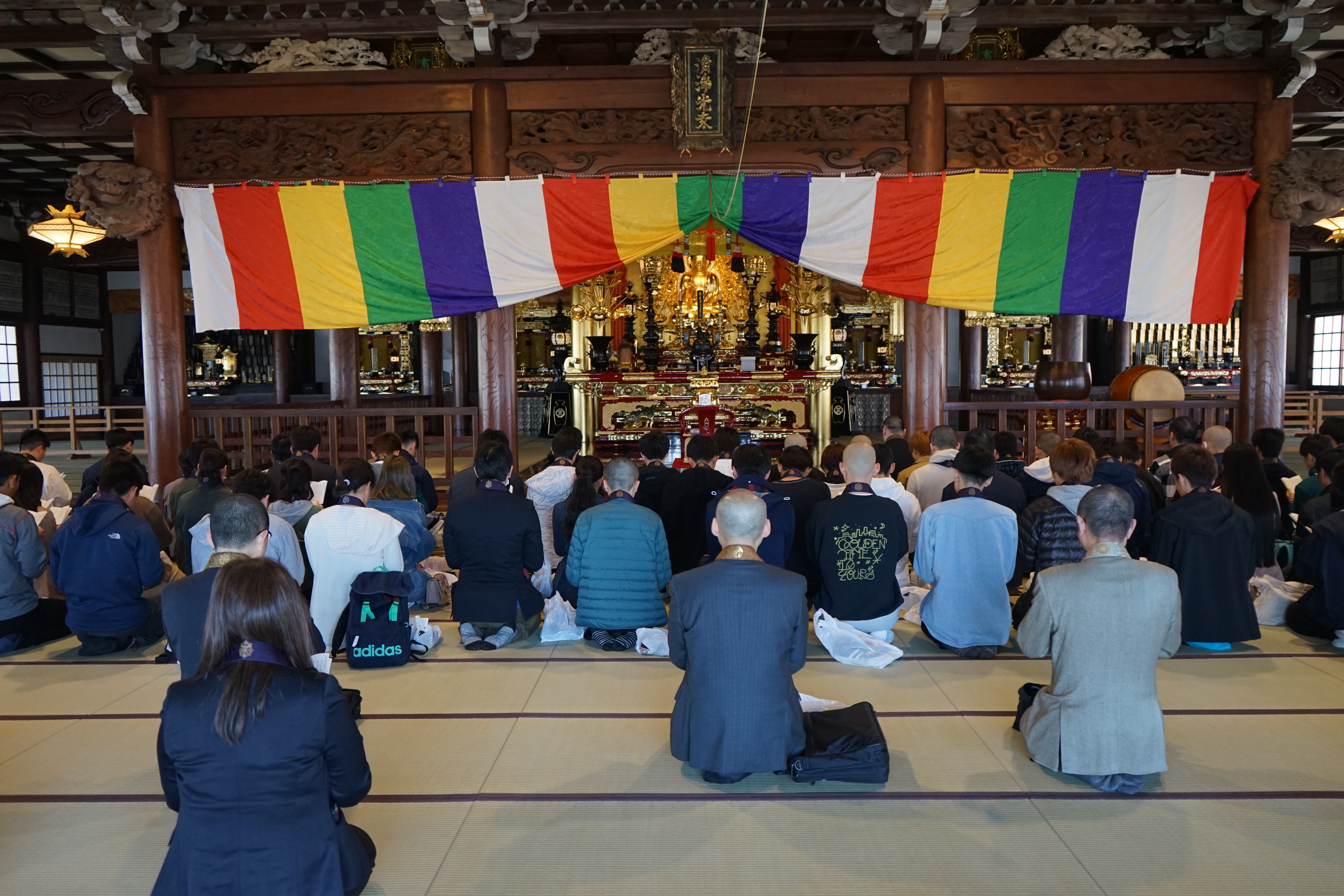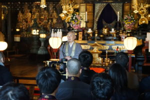 護国寺でも本堂で勤行し、大正大学のご出身の小林執事長よりお祝いの言葉とご自身の大学生活を交えて励ましていただきました。ご本尊様も特別に御開帳して頂きました。