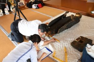 写真は主任学芸員と一緒に仏像の調査をしている場面です。こうした調査成果が展示へと結びついています。