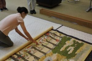 調査でお寺に伺うと文化財だらけです。仏像はもちろん、書画、襖絵、文書、書籍、水引柱巻、石造物、建物……その中には100年~200年前のもの、もしかしたらもっと古いものも今に伝わっています。しかも間近で体感できるというのはなかなかないことだと思います。例えば江戸時代に描かれた涅槃図を今でも涅槃会で懸けているお寺さんが多いと思いますが、200~300年前に描かれたものが、ガラスケースなしで拝見できることのすごさに気づくと、生きた文化財を目の前にしていると実感できます。写真はあるお寺から一時お預かりした涅槃図。江戸時代後期に描かれた作品で、今も涅槃会で懸けられているそうです。