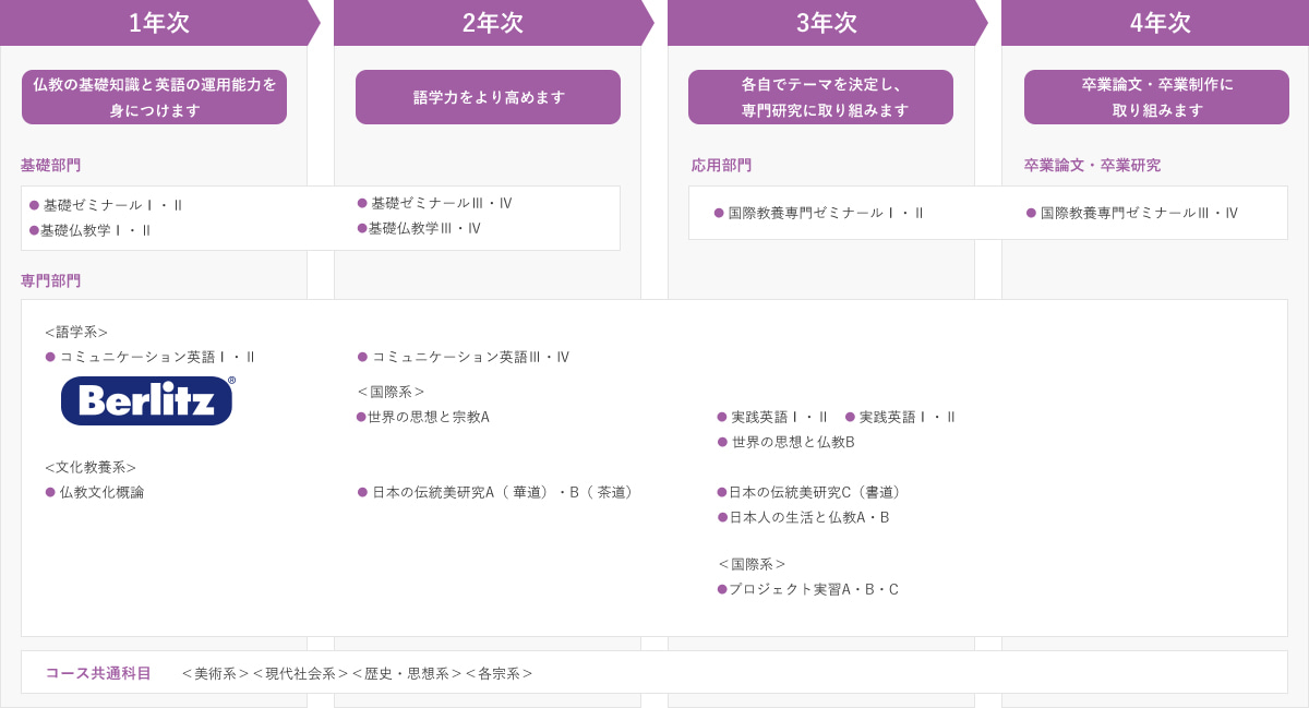1・2年次を通して英語のコミュニケーション能力を高めるとともに、仏教の基礎を学びます。2年次からは茶道・華道といった日本の伝統文化を体験する授業も。3年次にはビジネス英語を磨きながら、伝統文化について情報を発信する経験も積んでいきます。そして4年次には、それまでの学修から興味のあるテーマを選択し、卒業論文・卒業制作に取り組みます。