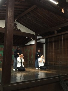 「大江能楽堂」の入口は然程大きくありませんので、中に入り、美しく立派な能楽堂を目にした学生達はとても驚きました。