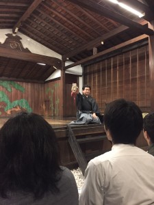 後半は能面のキャラクターや、微妙な表情の違いで年齢が解る裏ワザなどさらに詳しくご解説いただき、また講義の終盤には実際に舞台に上がらせて頂き、能を演じる際の独特な歩き方をご指導いただきました。
