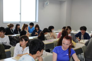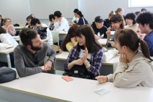 日本に滞在中のアメリカ人学生11名と国際教養コース1年生21名が合同授業を行いました。