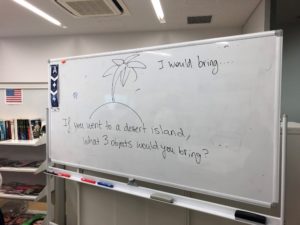 例えばこの日は、「If you went to a desert island, what 3 objects would you bring」、