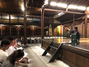 午後は京都市内の中心に位置する、「大江能楽堂」で能楽についての講義を受講しました。