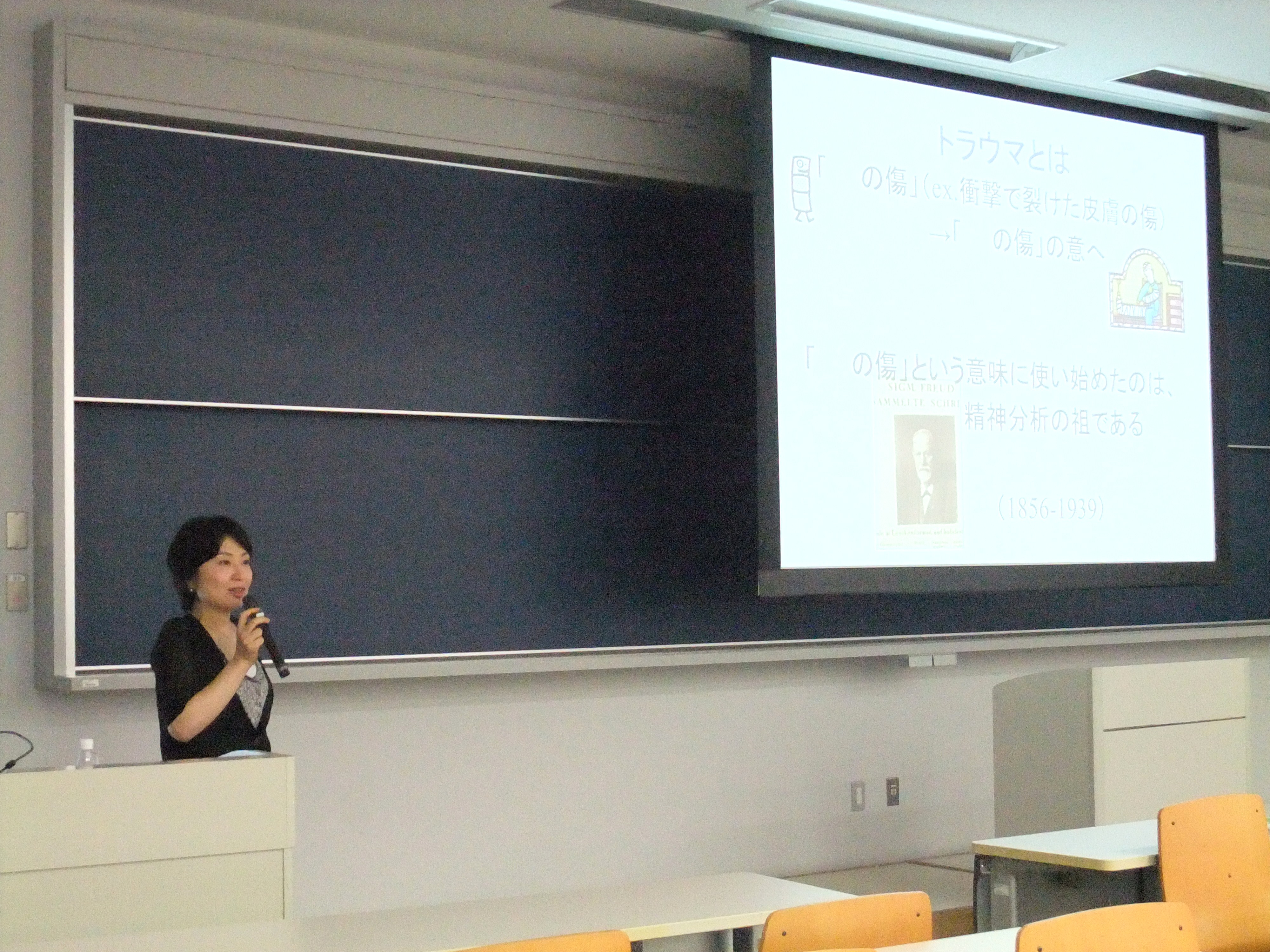 栁田先生の模擬講義は、『トラウマ心理学入門』ということで、日常で何気なく使っている「トラウマ」という言葉の意味からその心理的後遺症まで、スライドを使用しながら分かりやすくお話いただきました。