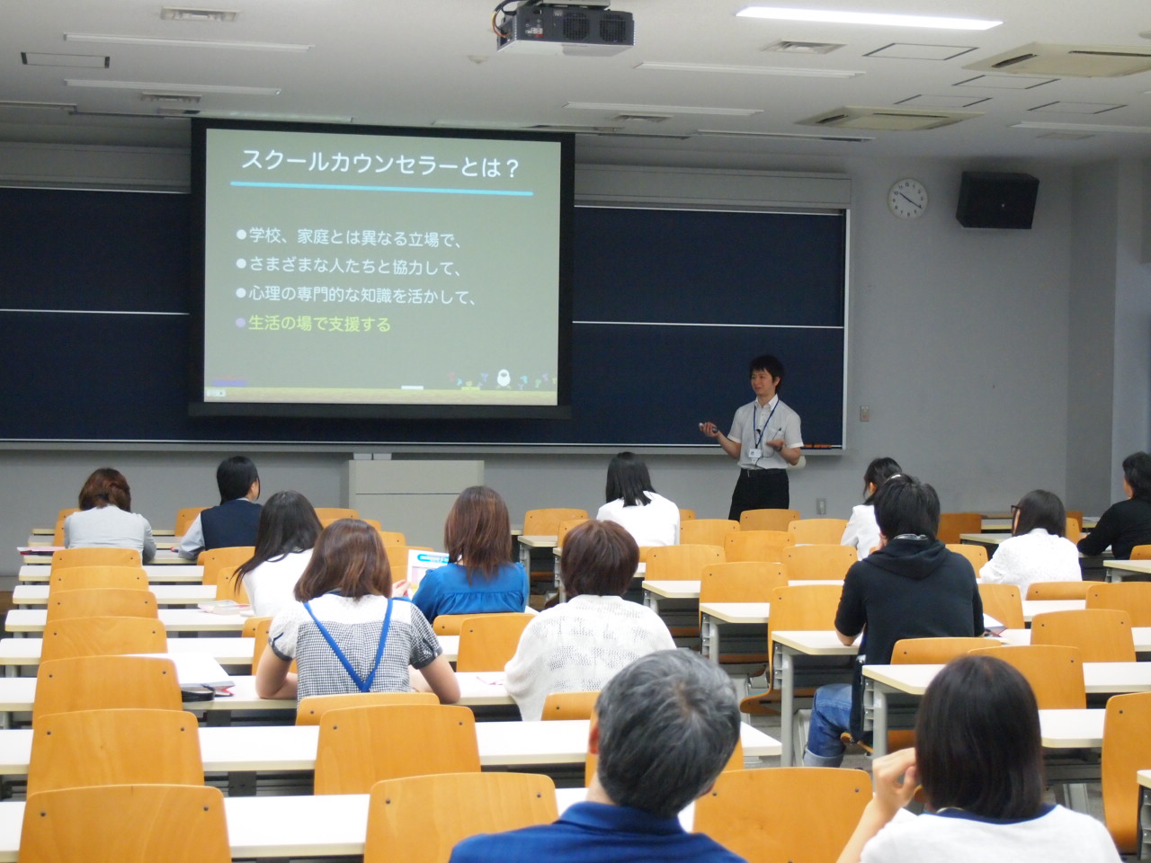 午前は「スクールカウンセラーってどんなお仕事?学校で臨床心理学が果たす役割」というタイトルで講義が実施されました。講義の前半にはスクールカウンセラーの役割や、実際の仕事内容について説明があり、後半では実際の小学校のクラスを題材としてスクールカウンセラーの仕事を疑似体験してみるワークが実施されました。参加者は挙手で自分の意見を表明し、何名かの受講生には意見も発表してもらいました。