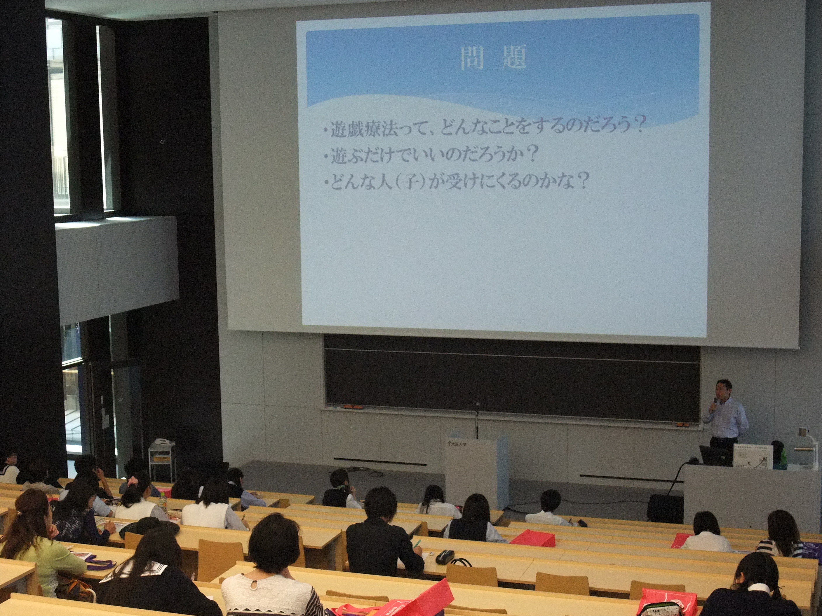 △2限の卯月先生の講義は、「遊戯療法(プレイセラピー)の基本」というテーマで、心理臨床の中での遊戯療法の位置づけや、その実際の様子などを、スライドで分かりやすくお話ししました。