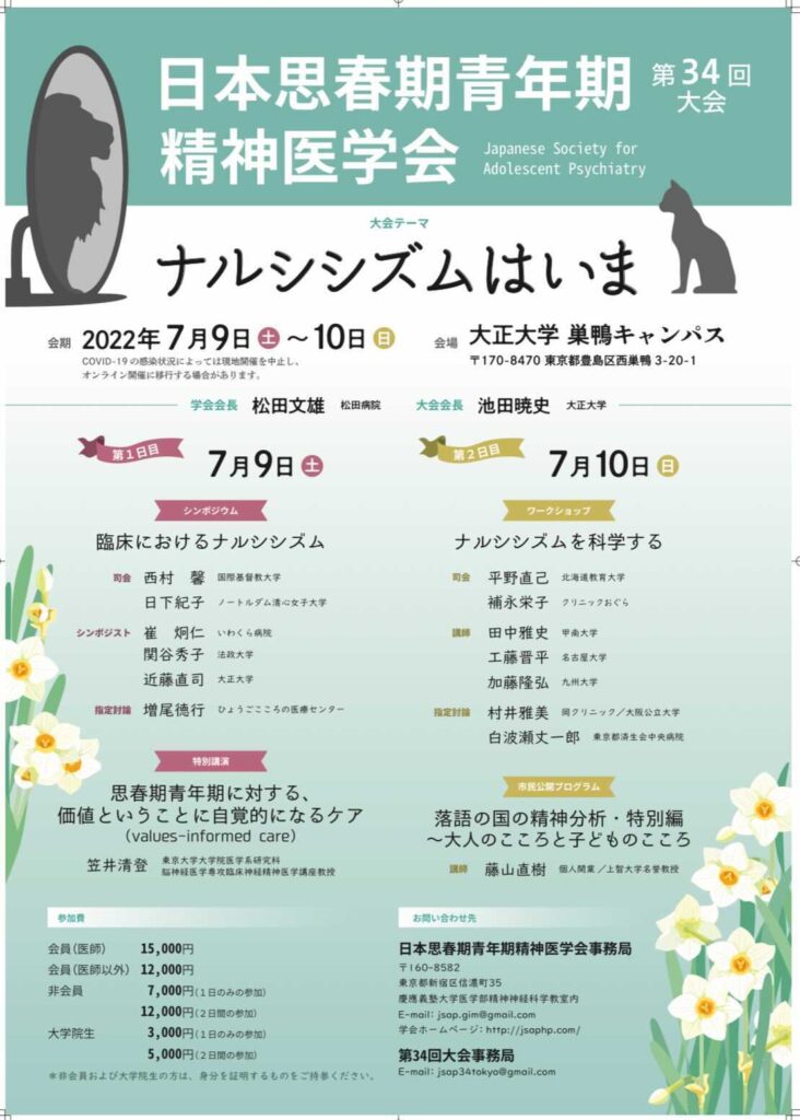 2022年7月9日(土)・10日(日)に大正大学・臨床心理学科教授・池田暁史大会長のもと、大正大学が主管校で第34回日本思春期青年期精神医学会を開催します。