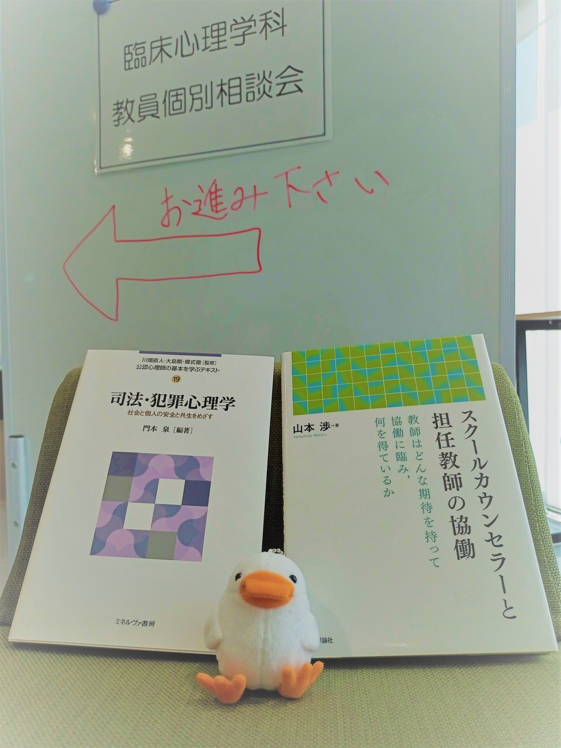 臨床心理学科がある6階閲覧室には、T-Duckが来校者をお出迎え、皆さん、閲覧室に並ぶ心理学の本がずらりと並ぶ本棚を見ながら、それぞれの「?」を解消すべく、教員との質疑に集中していました。