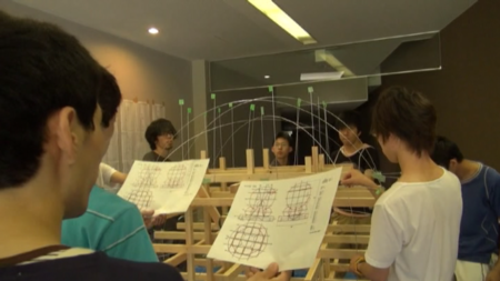 (1)8月8日9日の両日、本学で和紙はりのための針金のリード取り付けまでの作業を1年生の有志延べ35人、2年生の有志延べ20人、総勢55人で行いました。