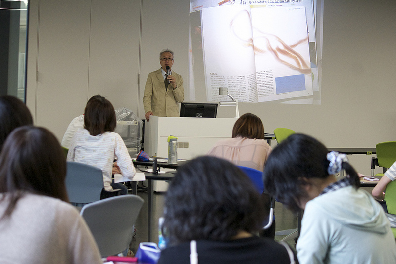 6月27日のワークショップⅤでは、ワールドフォトプレス編集局長で長年「monoマガジン」編集長をされていた土居輝彦氏がゲスト講義。土居氏は長年暖めてきた企画をこの3月にムックとして刊行。それが「The Cotton Culture & Style」。「コットン(綿)」をテーマに材料面から製品面まで歴史、地理、そしてファッションへと多視的に捉えた意欲的な一冊です。土居氏は発想から編集に至る、この本ができるまでを詳細に語っていただきました。また、モノ雑誌の専門家として文房具などのを製品をどう撮影するかのアドバイスもしていただきましたが、「モノに真っ正面から迫り、よく見る、とことんじっくり見る」という言葉は、今後、本格的な雑誌編集に入る3年生にとって、とても参考になったと思います。