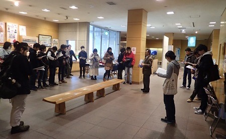 また、学外授業として、本年度は神奈川県立歴史博物館で開催された「かながわの遺跡展 縄文の海 縄文の森」を見学しました。貝塚や低湿地の遺跡から発見された骨角器や木製品などの有機質遺物が多数展示されており、通常、台地上の遺跡では残らない豊かな縄文人の生活の一端を知ることができました。