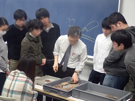 考古学は物質的資料を扱う学問なので、遺跡や遺構・遺物等がどのようなものかわからないとなかなか理解できないものです。そこで各回とも多くの画像を示しながら講義を行います。またときには本物の土器や石器などを教室に持ち込み、手にとって詳しく観察したり、質感を感じたりして理解が深められるようにしています。