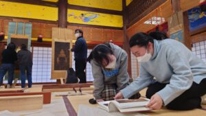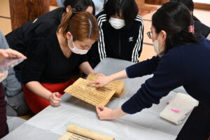 (宍戸さんから折本装の経典の扱い方を学びます)