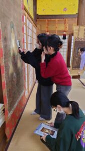 私たち大島ゼミは、仏教学科仏教文化遺産コースの中村ゼミと合同で、薬師寺に新しく設置されたサテライトキャンパスにて3泊4日の合宿を行いました。お寺の宿坊に泊まり、早朝にお堂を巡ってお経をとなえ(勤行)、丸まる2日をかけて絵画作品20点を調査しました。詳細は次の通り。