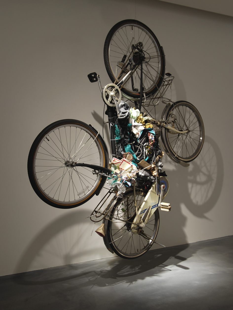 不要になった自転車を二台集め、組み合わせて、そのすきまとなったところに身の周りのもの(私の家に転がってたガラクタやギャラリーのオーナーの古着や靴などなんでも!)が詰まって一つのかたちを作っています。