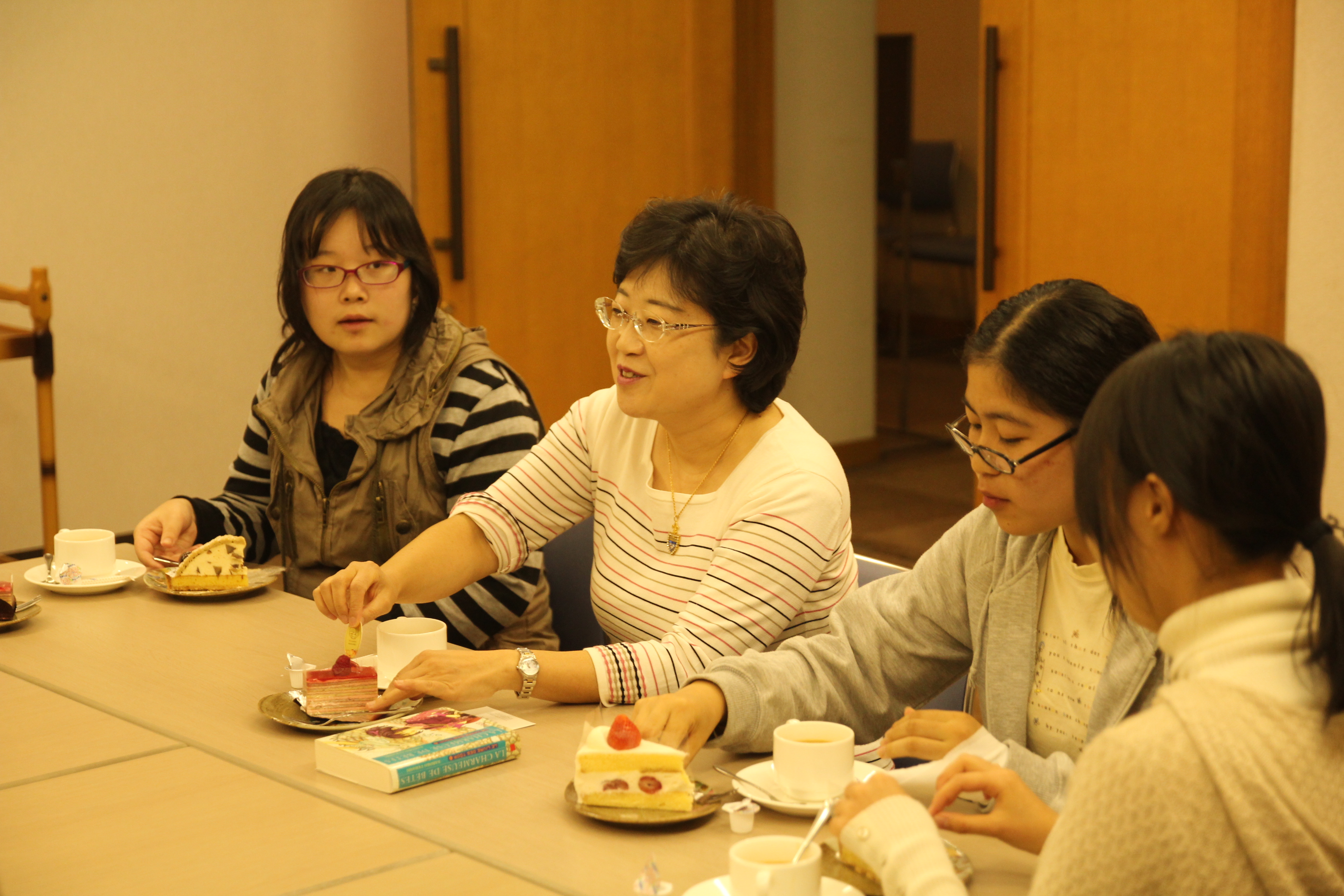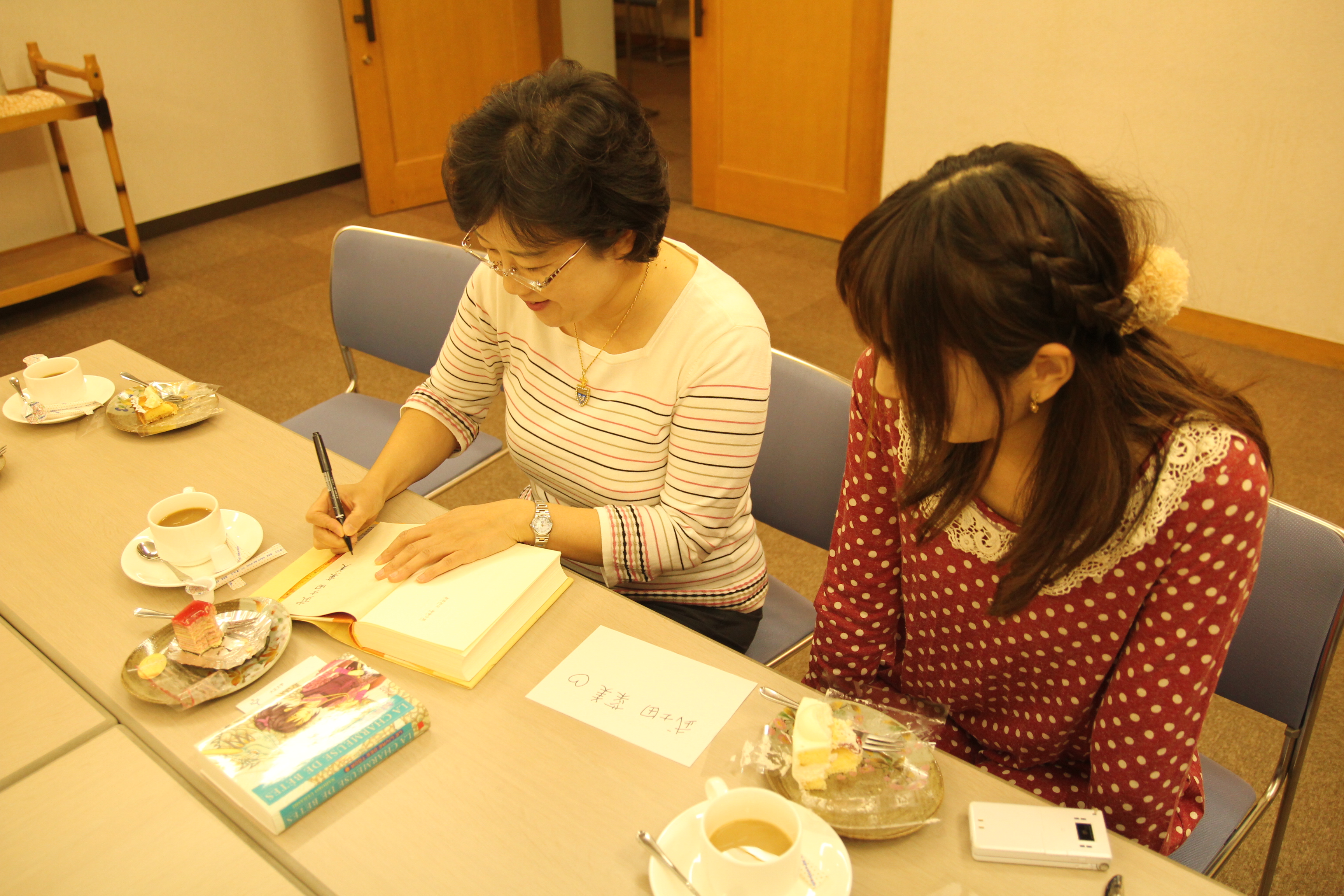 会議室のテーブルを集めた即席のパーティ会場で、上橋先生のおおらかなお人柄に学生たちの緊張も徐々にほぐれ、上橋先生を囲んで、おしゃべりの輪が広がりました。愛読書持参でサインをしていただいた学生もいます。![]()