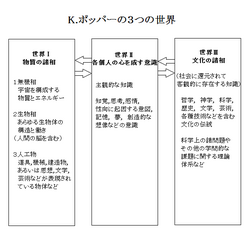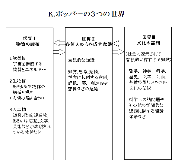 世界Ⅲについて補足しておきましょう。世界Ⅲは客観的に存在する知識の世界であり、そこには、科学・文学・芸術など、人間のもつ文化のすべてが、言語その他に還元された形で存在します。それが「本」ならば、紙やインクは世界Ⅰの存在物ですが、記されている知識は世界Ⅲに属します。絵画や音楽作品や彫刻についても同じことで、表現の手段が違っているだけです。一言でいうと、世界Ⅲは、過去から現在にいたる人類文化の所産から成りたっているのです。そこには、意思伝達のための言語や、各人の行動を支配する価値体系や、これらについての議論が、きわめて重要な意味をもつ要素として含まれています。