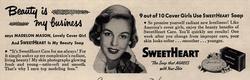 下の広告は、1950年のアメリカの化粧石鹸(toilet soap)の雑誌広告です。カバーガール(雑誌の表紙モデル)が「この石鹸で私は日々美しくなっている」と証言しています。白人であることが美しさの基準である時代です。石鹸が美しい肌をつくりだす、という広告はいまでもよく見かける宣伝文句ですが、ずっと同じ手法が続いているというのも興味深いことです。