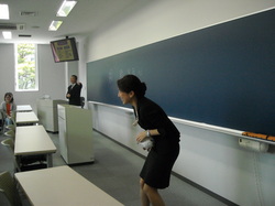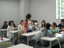 教室の端から端まで投げられたボールに、学生たちはドギモを抜かれました。でも「そうなんだ、ことばはそれくらい勢いよく、自信をもって、相手まで正確に届けなければならないのだ」ということを、一瞬のうちに呑みこみました。![]()