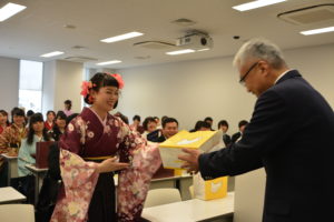 文学部卒業生総代の中山さん、学位記はもう礼拝堂でいただいています。お祝いの品だけになり、思わず、星川先生も笑い崩れています。