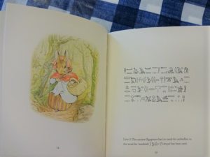 展示物の中には、珍しいヒエログリフ文字でかかれたピーター・ラビットの絵本もありました。