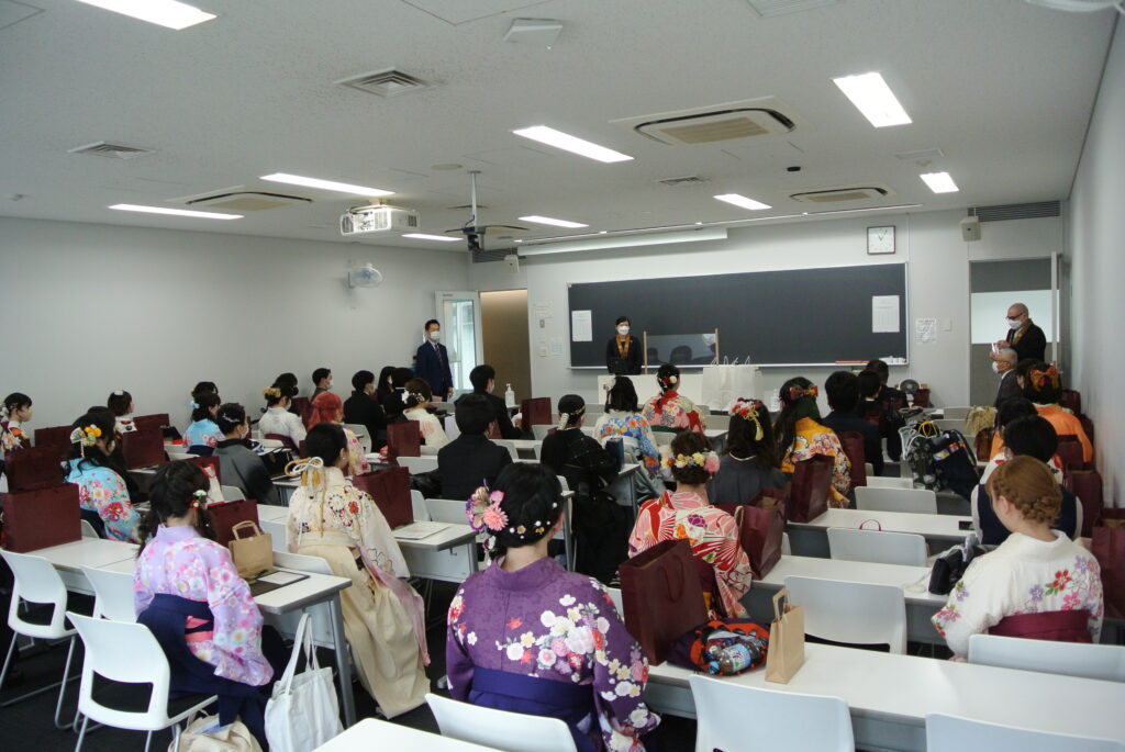 全体での式典の後、カルチュラルスタディーズコース・国際文化コースの4年生は学科・コース別の学位授与式のため一つの教室に集まります。