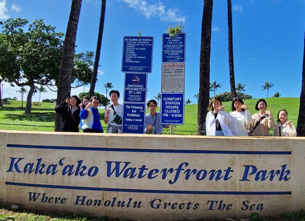 1日目は日本を出発し、現地時間の早朝にハワイに到着し、カカアコウォーターフロントパークでえひめ丸の話を聞き、その後アラモアナでランチ、そして大学で夕食という流れでした。