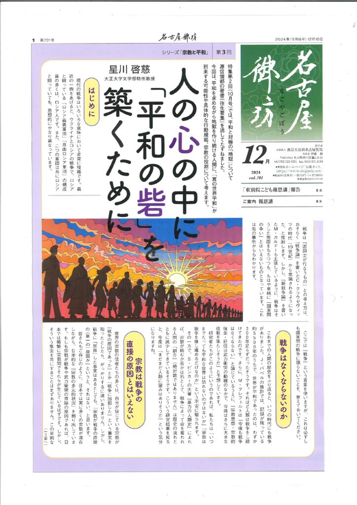 星川先生のエッセイ「人の心の中に〈平和の砦〉を築くために」が、真宗大谷派名古屋別院発行『名古屋御坊』の「シリーズ:宗教と平和」に掲載されました(2024年12月号紙上)ので、紹介いたします。 昨今の世界の状況を見るにつけ、「他者をリスペクトすること」が世界の平和につながることに、期待したいですね。