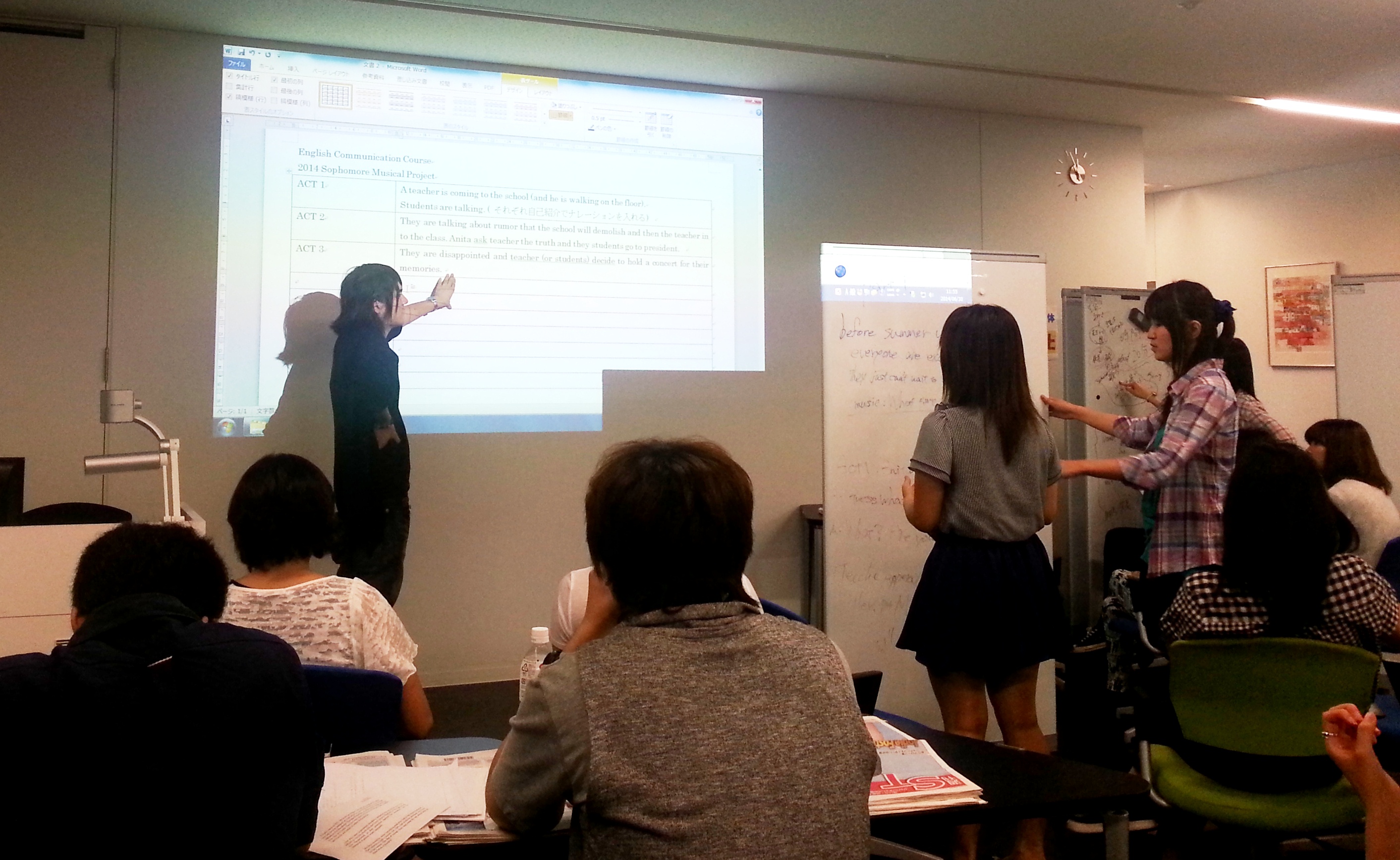 The second year students are making an original drama / musical. It takes a lot of teamwork and communication in order to make a good one. The students have finished making the script and have chosen the songs they want to sing. In this picture, you can see everyone working together and doing their best. I'm looking forward to seeing their final production.