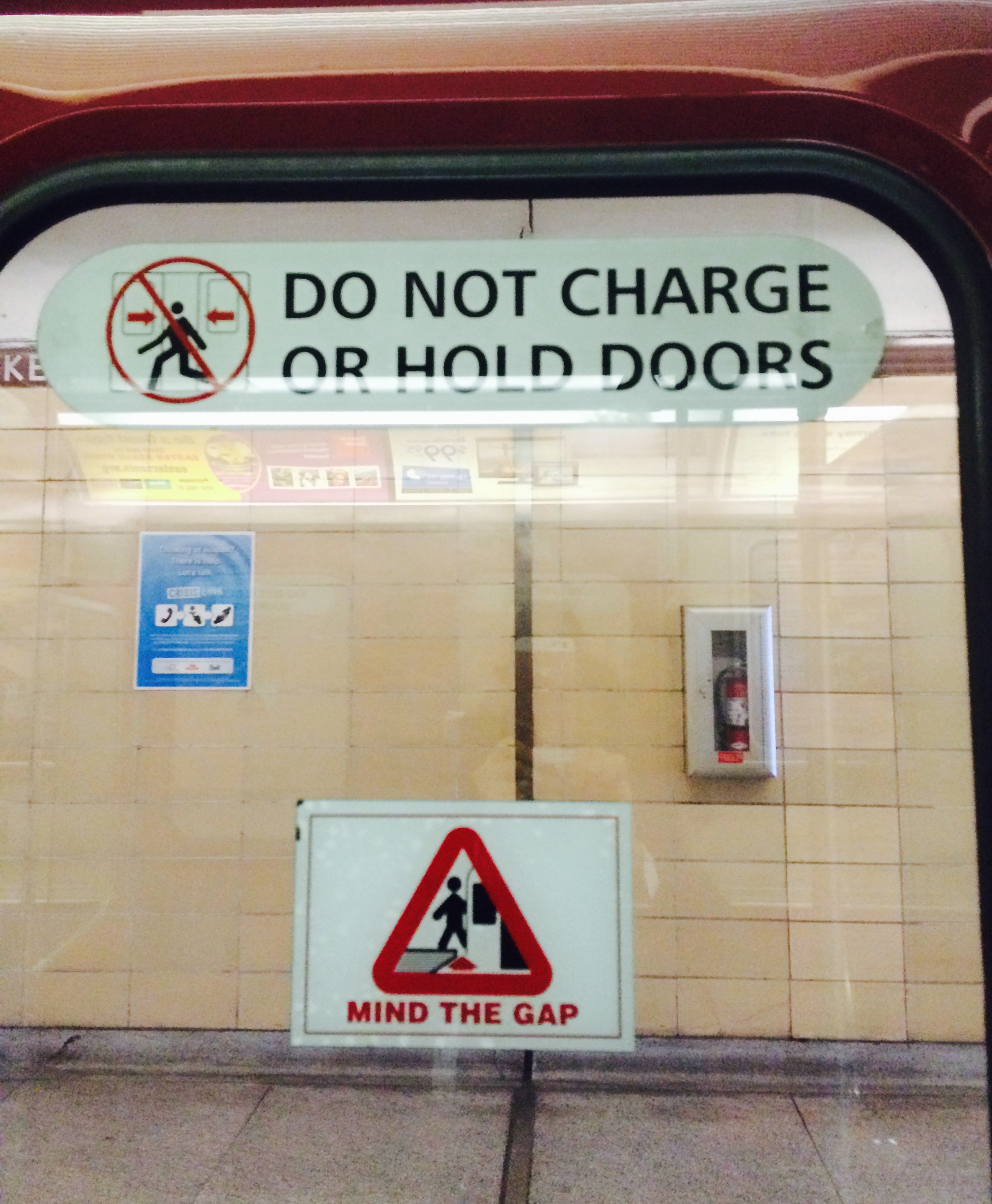 では、3枚目。どうでしょう。何を注意しているのでしょう。写真の下の"Mind the Gap"はもちろん「隙間に注意」です。では、上の方は?「駆け込み乗車」でしょうか。正解です。英語の"DO NOT CHARGE" の chrageには「突進する」という意味があります。現地で生活していれば自然と目にする表現ですが、教科書ではあまり見ませんね。つまり、「駆け込み乗車をしたり、ドアを抑えないでください」ということだったのです。