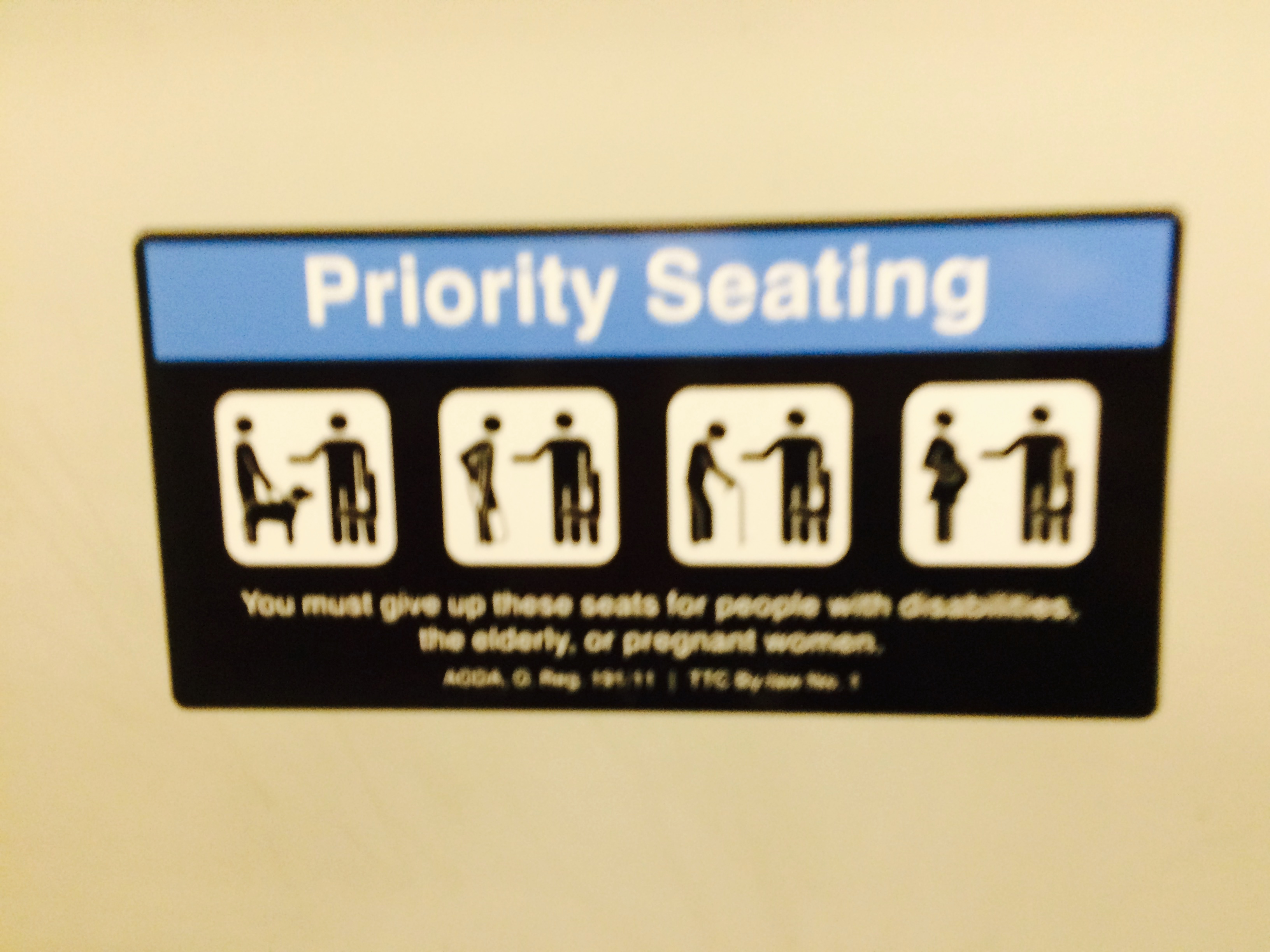 そのときの写真です。”SLIPPERY WHEN WET"とあります。文字がなくても、この絵があればすぐわかります。「滑りやすいので注意!」。では、2枚目は?これも問題ないですね。ただ、日本の標示だと「優先席」はPriority Seat になっていることが多いようですが、トロントの地下鉄ではPriority Seatingですね。