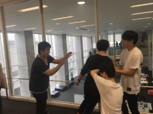 ッフに向かって倒れてもらうことで転倒することの恐怖を感じてもらう転倒体験
