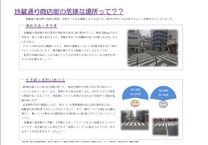 危険な場所、注意すべき点について詳しくまとめました。老化による身体機能の低下について調べて現地調査をした結果です。(例 地蔵通り商店街の横断歩道 死角が生まれる十字路・T字路)
