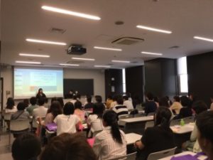 教室の席が足りなくなるほど多くの方が来場された説明会終了後、2年生の代表がリーフレットを手渡ししました。リーフレットを渡しながら、オープンキャンパスに来られた方の質問に答えることもできました。直接コミュニケーションを取ることができて嬉しかったです。