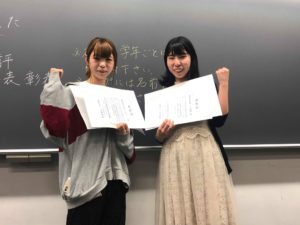 最優秀者には 3年生小林さくらさん、4年生 小川優希さんが選出されました。 それぞれコメントをいただきました。 小林さん 「自分の興味のある分野をもっと知りたいと思って始めたテーマだったのでやりがいもあり、とても嬉しかったです。今後も引き続き研究し、より良い論文にできるよう頑張ります!」 小川さん「この度はありがとうございました! 投票してくださったみなさん、発表を聞いてくださったみなさん、普段から論文に使えそうな情報提供をしてくれる友人やご指導くださる先生のおかげで、ラッキーなことにこのような賞を頂くことができました。テーマがテレビやSNSだったりと、みなさんにとってもおそらく身近なものなので興味を持って聞いていただくことができたのかなぁと思います。論文の中身はまだまだなので引き続きかんばります!運営をしてくださった2年生のみなさんも、お疲れ様でした!ありがとうございました!」 とお話ししてくださいました。