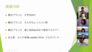 富士吉田市を訪問してのプレゼンが予定されていましたが、新型コロナウイルス感染拡大に伴って、リモートでの実施となりました。遠くにいる人と同じ空間と時間を共有し、会話ができるという不思議な体験でした。