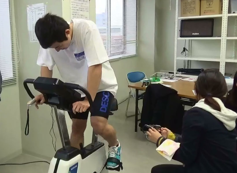 例えば、教室に来た順に学生は唾液中の酵素を測定します。ストレスの度合いとこの酵素の値に関係があると言われています。授業時数(15回)分の結果を確認してみたところ意外と変化がない(安定している)ことがわかりました。少なくともこの授業がストレスとはなっていない様子でした。また運動負荷テストでは運動部所属の学生に固定式自転車を限界近く(写真では伝わりにくいですが、がんばりました!)まで漕いでもらい、心拍数など生理指標について運動中、運動前後に測定しました。教科書に記述されていることと同じ現象を実際に行った実験から確認することができます。ただしテーマごとにレポートが待っていますので、楽しいだけではありませんが…。