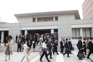 最初の写真は入学式直前の様子、次は入学式終了直後で「これから各学科ガイダンス」へと向かう様子です。緊迫しつつ急いでいる雰囲気がよくでています。